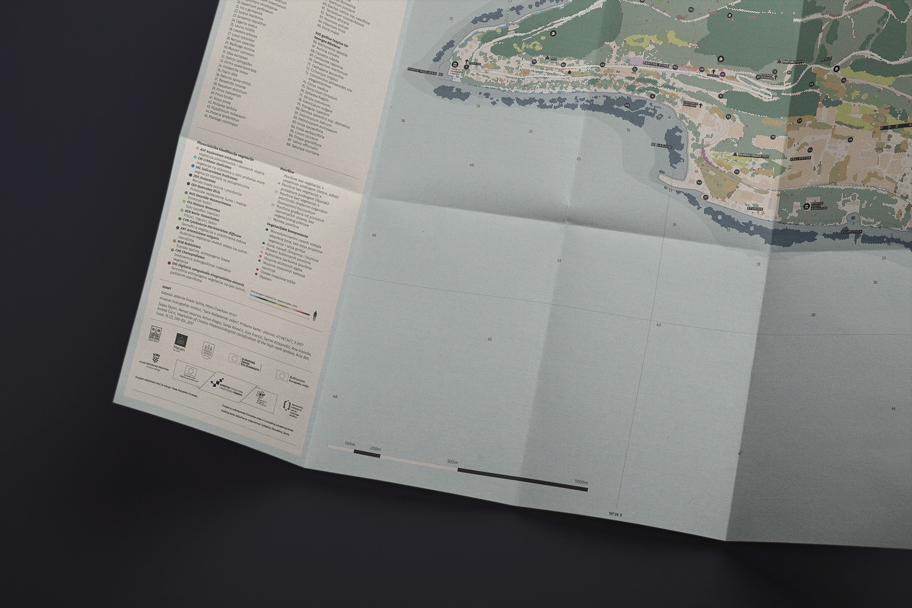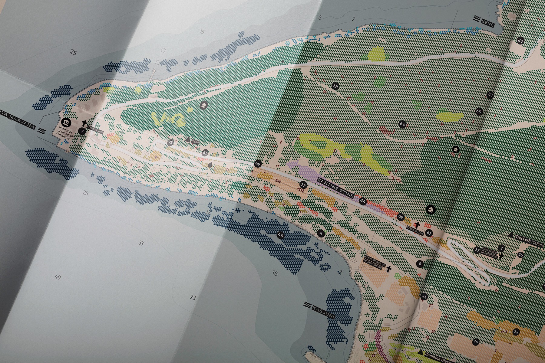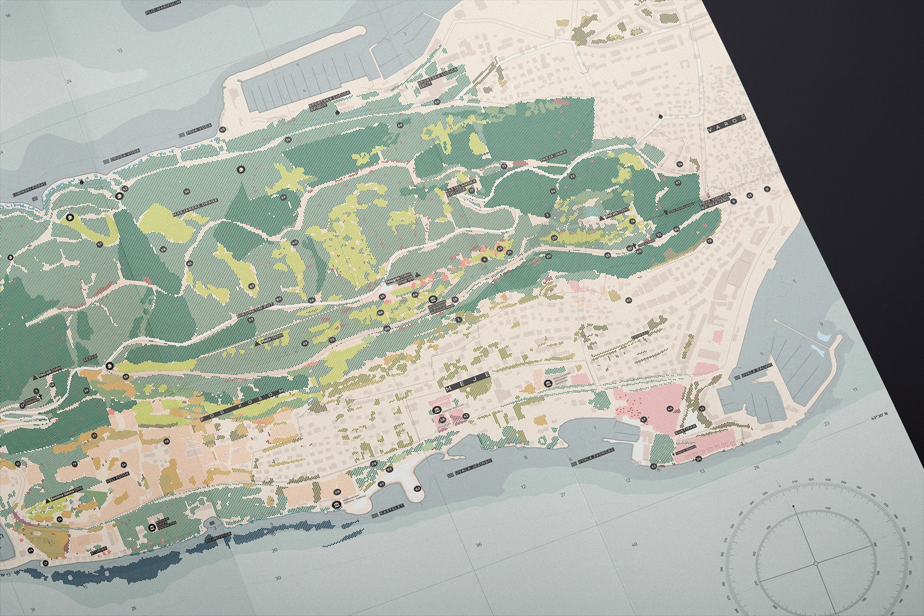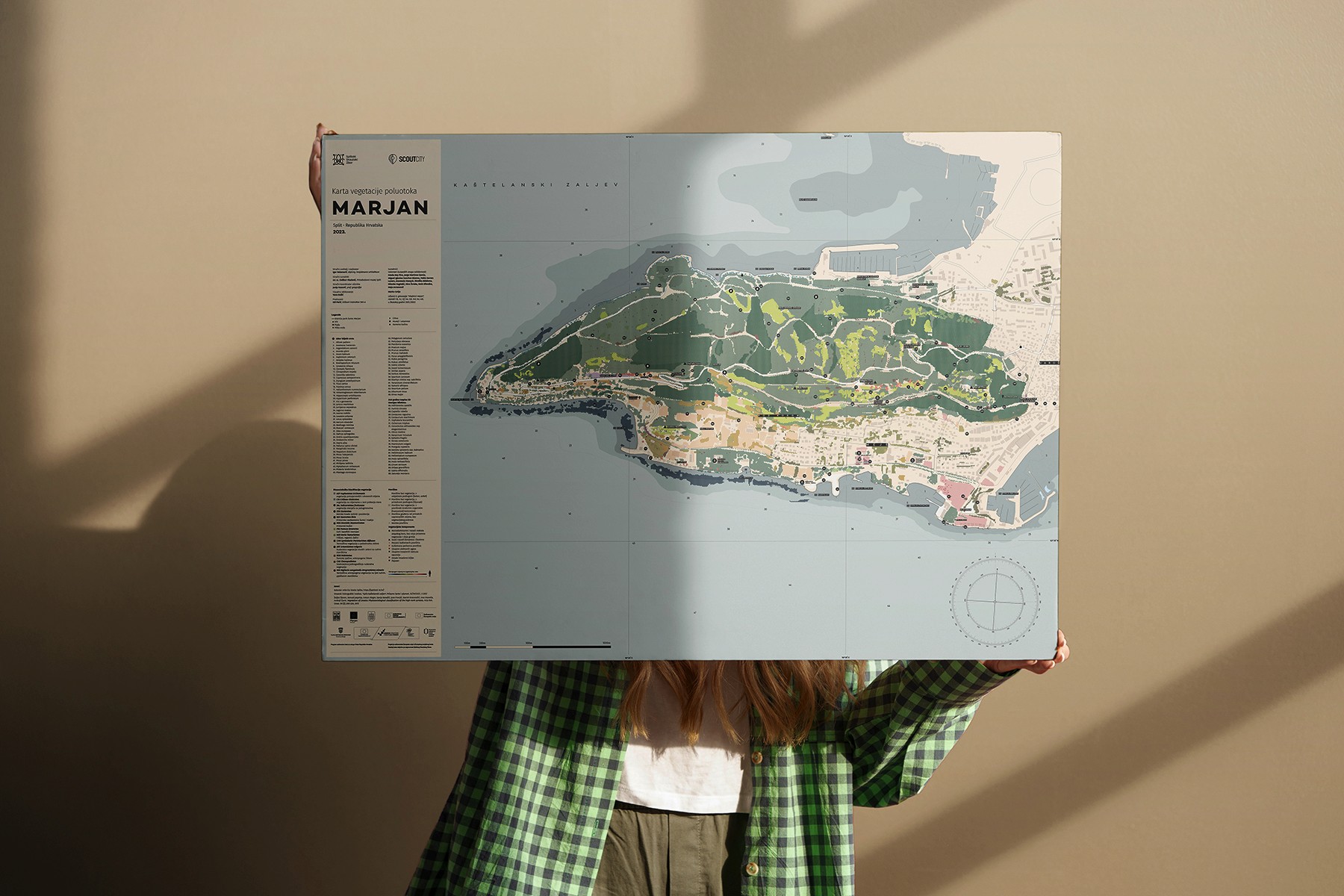 The official vegetation map of Marjan previously featured only three categories: forest, maquis, and dry grasslands. However, recent research of Marjan’s much richer biodiversity set ground for a new map to be designed which provides data on a much more detailed classification, akin to a treasure list. Newly established phyto-sociological classification includes 13 vegetation groups with additional specific categories, including invasive plants, each represented by its own color. This enhanced map is designed for everyone to understand the variety and abundance of vegetation on Marjan. Previously, only 15 protected plant species were known on Marjan, but the new research has identified as many as 70 protected species. Project and research was led by landscape architect Igor Belamarić.